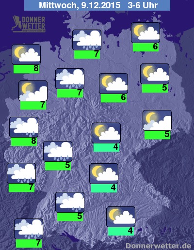 In der Nacht zum Mittwoch ist es über der Osthälfte des Landes zunächst trocken und meist locker bis aufgelockert bewölkt, über den westlichen Landesteilen befindet sich stattdessen ein Wolkenband mit Regen, das sich zunächst etwa vom Saarland bis nach Schelswig-Holstein erstreckt. Im weiteren Nachtverlauf zieht das Regenband weiter nach Osten und erreicht gegen Morgen auch die östlichen Landesteile. Weiter nach Westen klingt der Regen wiederum ab und der Himmel klart zunächst im Westen und nachfolgend weiter nach Osten hin wieder auf. Die Temperatur sinkt auf 8 Grad am Niederrhein und bis 4 Grad in Rosenheim.