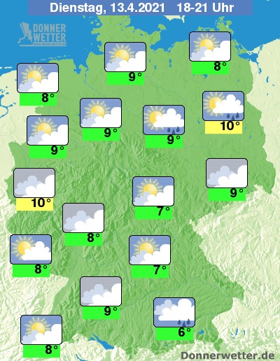 Heute Abend lockert die Bewölkung vielerorts auf, lediglich im Osten und Südosten bilden sich noch vereinzelte Schauer, die zum Teil auch mit Schnee durchsetzt sind. Gebietsweise bleibt es auch stark bewölkt bei Werten von 6 Grad in München und bis 10 Grad in Berlin.