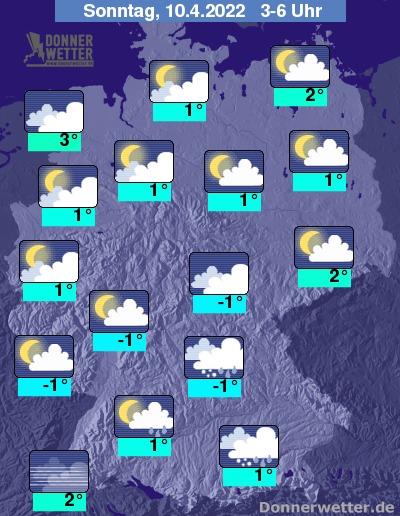 In der Nacht zum Sonntag fällt im Süden untern dichten Wolken gebietsweise Schnee. Im übrigen Land ist es oft locker bis aufgelockert, teils ist es auch stark bewölkt, dazu bleibt es trocken. Die Temperatur sinkt auf 3 Grad in Bremerhaven und bis -1 Grad in Jena.