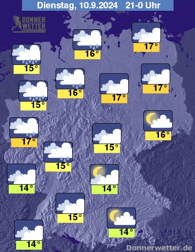 Am Dienstagnachmittag zeigt sich der Himmel über weiten Landesteilen wechselnd bewölkt und es sind nur selten Schauer möglich. Zum Abend hin verdichten sich die Wolken von Nordwesten her und es muss in Folge mit schauerartigem und teils gewittrigem Regen gerechnet werden. Im Westen und Nordwesten weht ein teils böiger Wind, an der Nordseeküste stürmisch.
