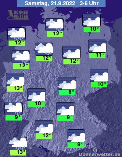 In der Nacht zum Samstag bringen kompakte Wolken im Norden und Nordwesten zeitweise Regen, zum Morgen hin zieht auch im Südwesten Regen auf. Im übrigen Land bleibt es ebenfalls verbreitet dicht bewölkt, allerdings trocken. Die Temperatur sinkt auf 13 Grad in Bonn und bis 8 Grad in Jena.