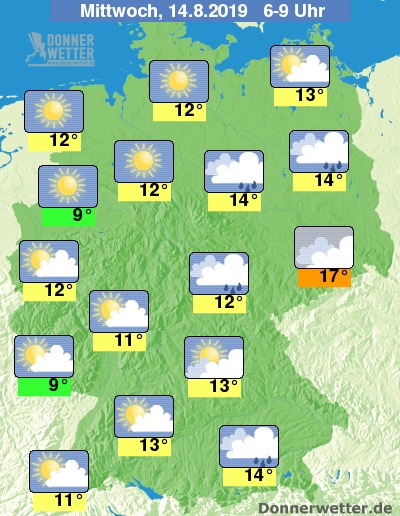 Die Wochenmitte startet vor allem in der Nordwesthälfte mit häufig wolkenlosem Sonnenschein, im Süden und Südwesten wechseln sich Sonne und Wolken in den Frühstunden ab. Dichte Wolken halten sich in der Früh im Südosten und Osten des Landes, vor allem östlich der Elbe und an den Alpen muss zudem mit Schauern gerechnet werden.