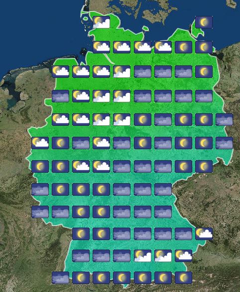 In der bevorstehenden Nacht ist der Himmel zum größten Teil sternenklar. Lockere Wolkenfelder ziehen vor allem über den Norden und Westen hinweg, dazu bleibt es trocken. Die Temperatur sinkt auf 12 Grad in Emden und bis 2 Grad am Alpenrand.
