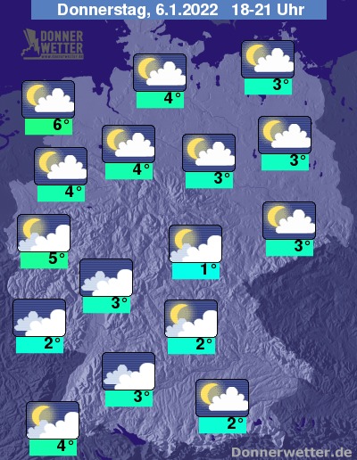 Heute Abend zeigt sich die Nordhälfte überwiegend locker bewölkt, weiter nach Süden hin ist es teils stark, teils aufgelockert bewölkt, es bleibt jedoch überall trocken. Die Temperatur liegt bei 1 Grad in Erfurt und bis 6 Grad in Cuxhaven.