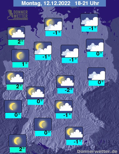 Die Temperaturen gehen bis Mitternacht auf Werte um 0 Grad in der Kölner Bucht und -6 Grad am Alpenrand zurück.