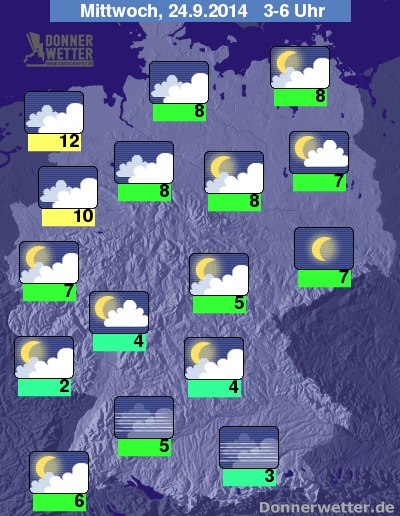 In der Nacht zum Mittwoch bleibt es im Süden und Osten zunächst noch klar oder gering bewölkt, zum Morgen ziehen im Osten aber teils dichtere Wolken auf, im Süden bleibt es jedoch meist gering bewölkt. Vielfach dicht bewölkt ist es im Norden, an der Grenze zu Dänemark ist auch der ein oder andere Schauer möglich, sonst bleibt es aber trocken. Die Temperatur sinkt auf 12 Grad an der Ems und etwa 2 Grad im Bliesgau.
