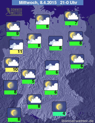 Heute Abend halten sich von der Mitte des Landes bis nach Osten hin noch oft dichte Wolken, dazu bleibt es aber weitgehend trocken. In der anderen Landesteilen ist es hingegen überwiegend locker bis aufgelockert bewölkt und dabei trocken. Im Süden und Südwesten der Republik zeigt sich der Himmel sogar meist sternenklar, dazu bleibt es natürlich ebenfalls trocken. Die Abendtemperatur liegt bei 11 Grad im Emmerich und 4 Grad in Augsburg.