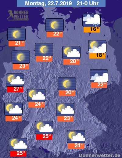 In den späteren Abendstunden lockern die Wolken im Norden verbreitet auf, vielfach ist es dann sternenklar. Dichtere Wolken, die selten auch mal einen Schauer bringen können, halten sich dann meist nur noch entlang der Oder. Im Süden Deutschlands überwiegen lockere Wolken.