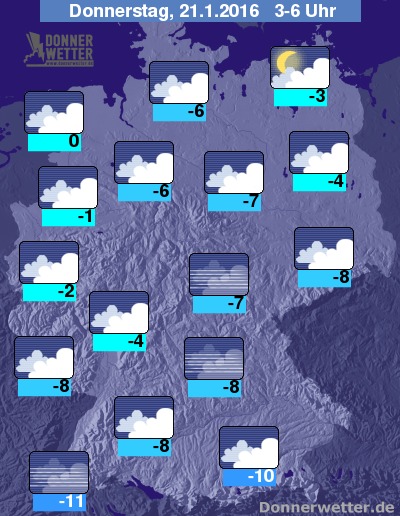 In der Nacht zum Donnerstag zeigt sich das Wetter über der Südhälfte Deutschland häufig stark bewölkt oder neblig-trüb, dazu ist hier und da etwas Schneegriesel möglich, sonst bleibt es aber weitgehend trocken. Im Norden ist es ebenfalls meist stark bewölkt, jedoch komplett trocken. Hier und da lockert es auch auf. Die Temperatur sinkt auf 0 Grad an der Nordsee und -11 Grad in Freiburg. Stellenweise besteht Glättegefahr!