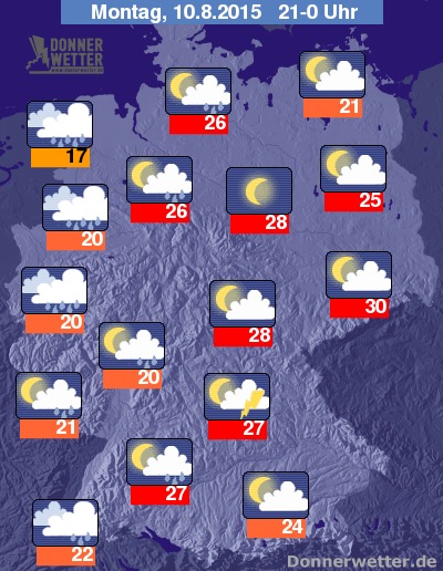 Heute Abend zeigt sich der Himmel vom Nordosten, über den Osten bis in den Südosten des Landes oft sternenklar oder nur leicht bewölkt, dazu bleibt es trocken. Weiter nach Westen hin ziehen hingegen oft dichte Quellwolken durch und es können sich verbreitet Schauer und auch mögliche, teils kräftige Gewitter entwickeln. Die Abendtemperatur liegt bei heißen 30 Grad in Niederschlesien und etwa 17 Grad im nördlichen Emsland.