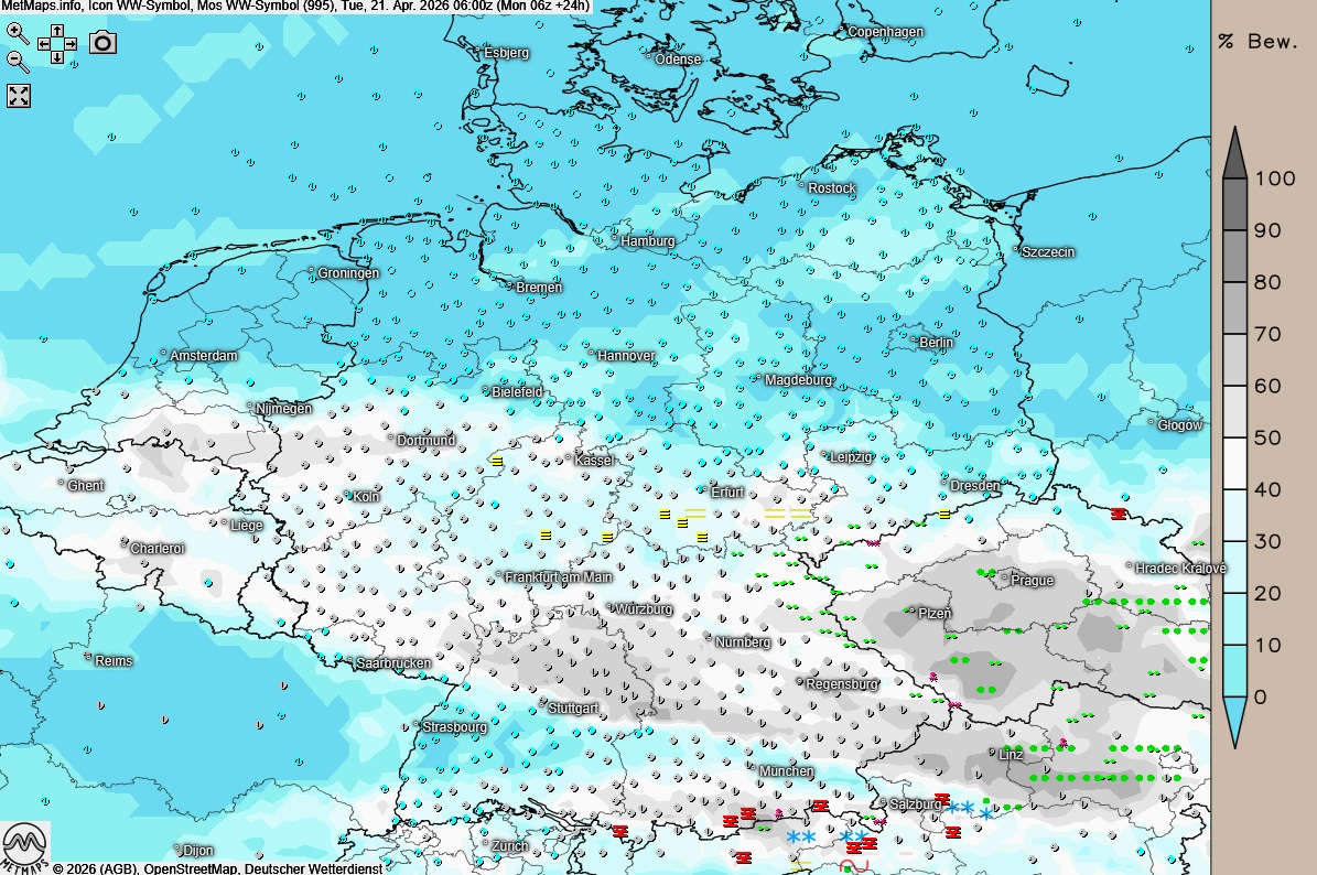 Die Nacht zum Donnerstag bringt dann erneut die Gefahr von Frost. Während von der Nordsee dichte Wolkenfelder auf den gesamten Norden übergreifen, bleibt es im Rest des Landes gering bewölkt oder klar. Die Tiefstwerte liegen zwischen 6 und 0 Grad, wobei in der Mitte und im Süden stellenweise Frost bis -2 Grad sowie verbreiteter Bodenfrost auftreten.