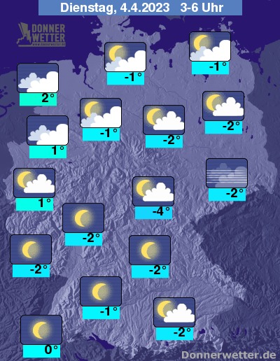 In der kommenden Nacht ist es überwiegend locker bewölkt oder sternenklar. Im Norden ziehen zunehmend dichte Wolken durch, die jedoch keinen Regen bringen. Im übrigen Land bleibt es ebenfalls trocken bei Tiefstwerten von 2 Grad an der Nordsee und bis -4 Grad im Grabfeld.