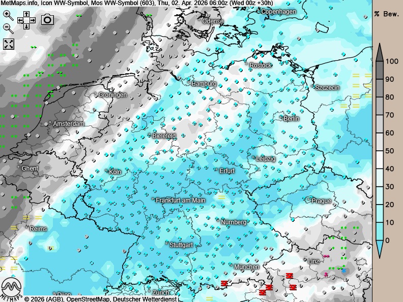 Am Gründonnerstag zeigt sich der Himmel über dem Nordwesten stark bewölkt, dabei kann lokal etwas Regen fallen. In den übrigen Landesteilen verläuft der Vorfeiertag heiter, an den Alpen zeitweise auch wolkig, und es bleibt meist niederschlagsfrei.