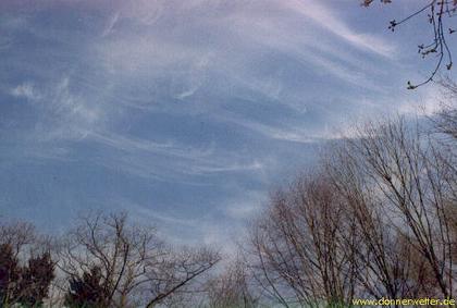 Seltsam, oder? So seltsam, dass einige sogar Verschwörungen vermuten, die Chemikalien in den Himmel sprühen und so das Wetter beeinflussen. Die Realität ist komplizierter: Je nach Wetterlage und Bedingungen in der Atmosphäre verhalten sich Kondensstreifen komplett unterschiedlich. Bei sehr trockener Luft wird die Feuchtigkeit des Steifens sofort aufgenommen, der Streifen verschwindet. Ist die Luft feuchter, bleibt der Streifen länger stehen, kann aber durch Höhenwinde zerrissen werden. Und wenn er sehr lange bleibt, dabei langsam auseinander treibt, milchig wird, hat er sogar prophetische Kräfte und kündigt einen Wetterwechsel an! In der Höhe kommt eine neue Luftmasse an, der Kondensstreifen nimmt nur die natürliche Entwicklung vorweg: Die Feuchtigkeit kondensiert, es bilden sich Cirrus-Wolken, die aussehen wie faserige Federn. Danach wird der Himmel immer grauer, meist setzt sogar Regen ein.