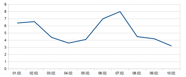Am Aschermittwoch wurde mit einem Wert von 3,2 Grad C der bisherige Monatstiefststand erreicht.