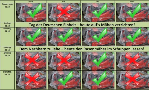 Durch Feiertag und Sonntag stehen in dieser Woche nur noch der heutige Donnerstag und der Samstag als Mähtage an - und beide erlauben einen meist trockenen Rasenschnitt.