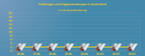 Das sommerlich warme Wetter sowie die Sommerferien in einigen Bundesländern senken in dieser Woche die Erkältungs- und Grippewahrscheinlichkeit.