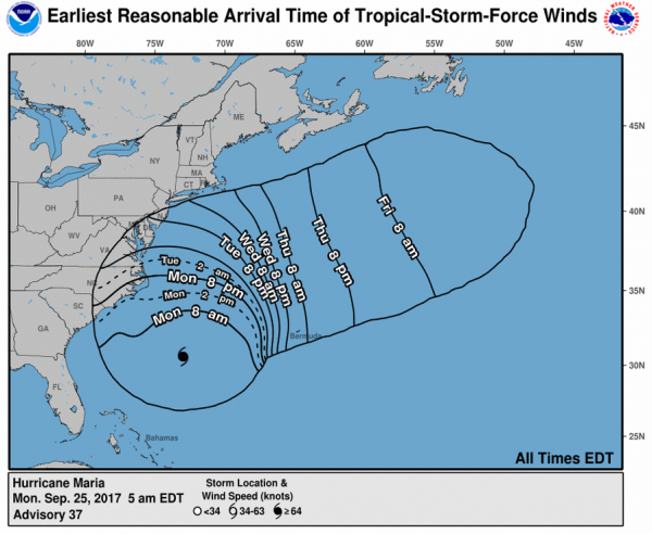Hurrikan Maria befindet sich zur Zeit rund 700 Kilometer östlich des US-Staates Florida. Er zieht mit ungefähr 15 Kilometer pro Stunde über das Meer und erreicht dabei durchschnittlich Windgeschwindigkeiten von 185 km/h.