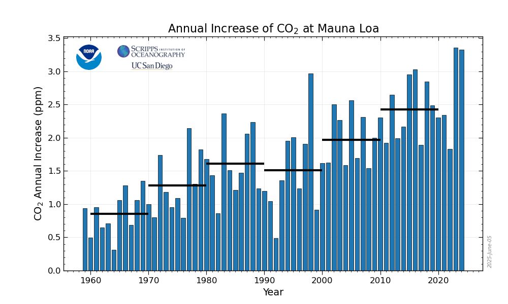 Die Konzentration von Kohlendioxid in der Atmosphäre steigt seit Jahrzehnten kontinuierlich an.