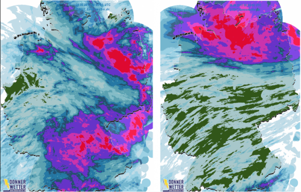 Die ergiebigen Regenfälle von der Ostsee über die Mitte des Landes bis in den Süden, setzten sich am Mittwoch (26.07.) fort - wobei sich der Schwerpunkt der Regenfälle im Tagesverlauf aber eher in Richtung Thüringen, Sachsen und Bayern verlagerte. Vor allem im südlichen Niedersachsen kam es durch die tagelangen Regenfälle zu größeren Überflutungen. Im Westen und Nordwesten des Landes stellte sich eine Wetterberuhigung ein. Bei längeren sonnigen Abschnitten konnten die Temperaturen im Emsland bis auf angenehm warme 25 Grad C klettern. Im Dauerregen über Bayern wurden allerdings kaum mehr als 14 Grad C gemessen.