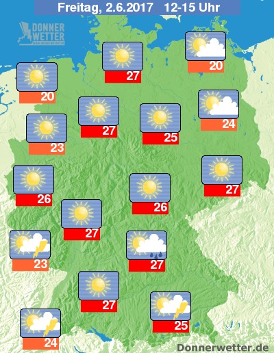 Der Donnerstag (15.06.) startete vielfach sonnig, bis zum Nachmittag erwärmte sich die Luft auf 26 bis 32 Grad C. Im Laufe des Nachmittags zogen von Westen mächtige Gewitterwolken auf, örtlich gingen Platzregen und Hagel nieder. Zum Teil gab es Sturmböen, die vor allem in NRW - und hier besonders im Ruhrgebiet - auch größere Schäden anrichteten. Im Anschluss daran purzelten die Temperaturen nach unten, in der Nacht erreichte die Front auch die östlichen Landesteile. Die höchste Temperatur wurde mit 32,5 Grad C am Flughaften Köln / Bonn gemessen, gefolgt von Trier mit 32,3 Grad C. Der dritte Rang ging an Andernach mit 32,1 Grad C.