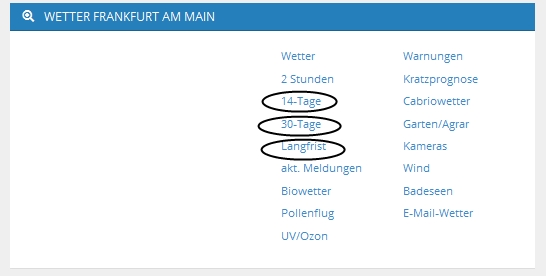 Das individuelle Mittel- und Langfristwetter für Ihren Ort finden Sie nach Postleitzahleneingabe auf der Hauptseite unter '14- Tage', '30-Tage' und 'Langfrist'.