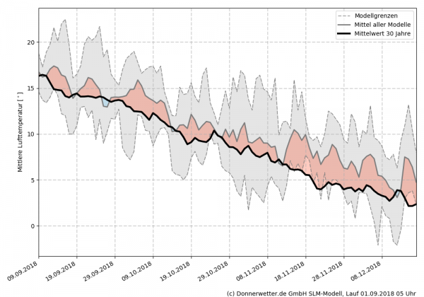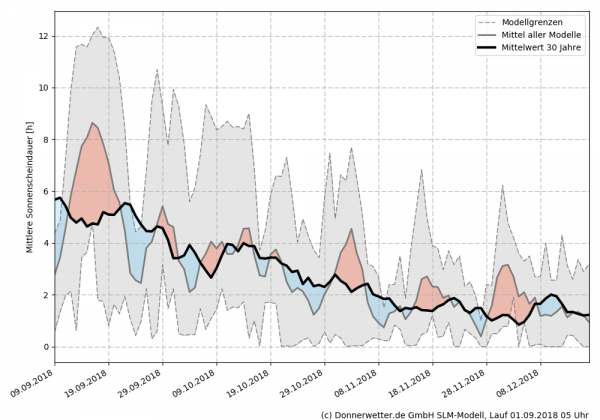Auch im Westen zeigen die Langfristmodelle eine steigenden Durchschnitt der Lufttemperatur im Vergleich zu den Jahren zuvor. Der Regen wird zunehmen und Nachts wirds deutlich kälter. Alles lässt auf einen gemischten September schließen, denn auch die Sonnenscheindauer zeigt keine genaue Tendenz.