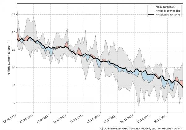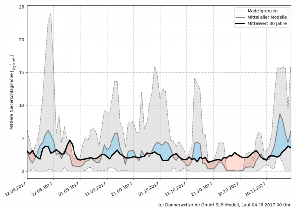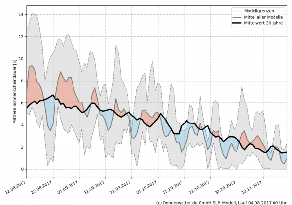 Weitgehend am langjährigen Mittelwert orientieren sich in den kommenden Wochen die mittleren Lufttemperaturen im Norden des Landes. Und auch bei den Niederschlagssummen sind momentan keine großen Sprünge zu erwarten. Die Phasen mit den höchsten positiv abweichenden Anzahl an Sonnenstunden berechnet unser Modell aktuell für den Zeitraum um Mitte August sowie für die erste Septemberhälfte.