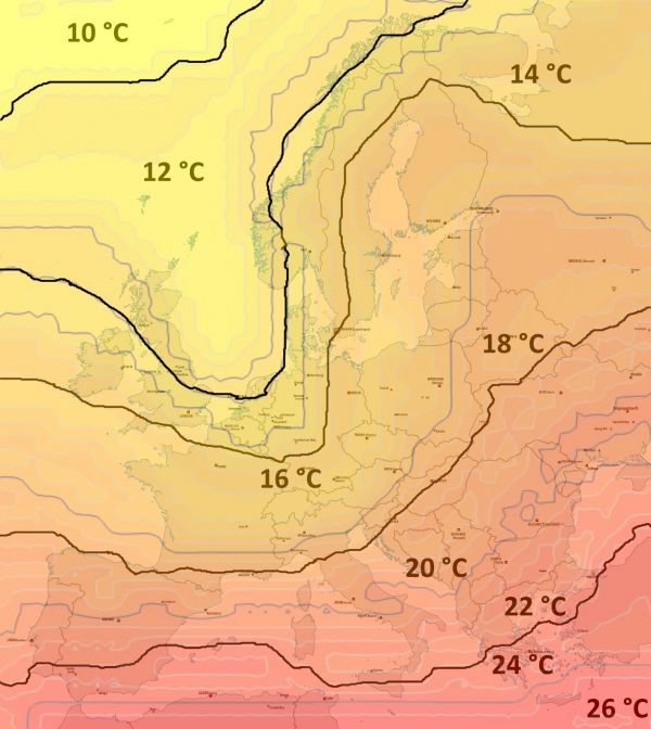 Unser Karte zeigt die zu erwartenden Mitteltemperaturen in Europa Ende Juli: