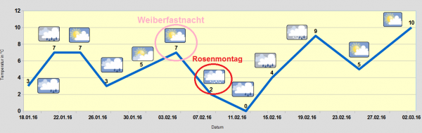 Nach einem häufig sonnigen Rosenmontag 2015, deutet sich für dieses Jahr nach aktuellem Stand deutlich kühleres und unbeständigeres Wetter an.