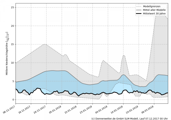 Die Farbe Blau dominiert in den aktuellen Prognosegrafiken für den Süden des Landes und symbolisiert einen sehr winterlichen Wetterverlauf in den nächsten Wochen. Sowohl die aktuell berechneten mittleren Lufttemperturen als auch die Sonnenscheindauer liegen zum Teil deutlich unter dem Durchschnitt. Positiv verläuft dagegen die Niederschlagsbilanz. Die Schneeschaufel sollte also in Griffweite stehen.