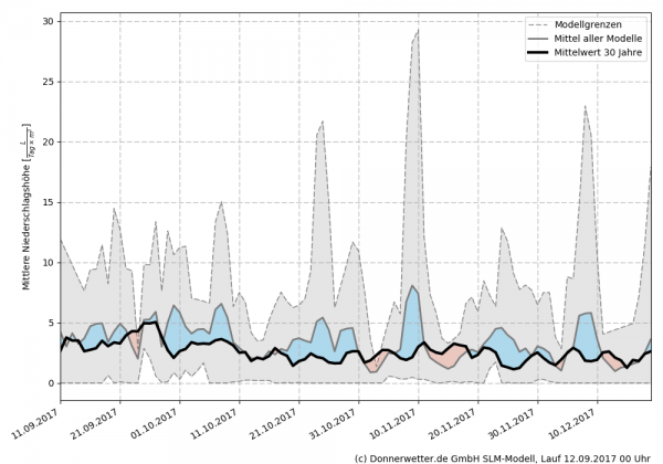 Die Temperaturen machen in den nächsten Wochen im Süden kaum nennenswerte Sprünge, wohl aber die laut unserem aktuellen Berechnungsmodell zu erwartenden Niederschlagssummen: Über weite Teile des Herbstes sieht es zu nasse aus. Ein wenig Licht am Himmel gibt es dann aber doch: Vor allem die zweite und dritte Oktoberdekade hat auch immer wieder Sonne mit im Gepäck.