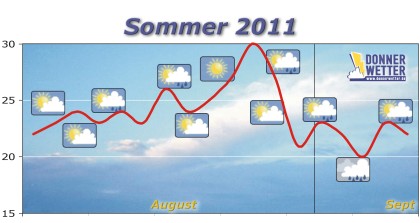 „Aktuell sieht es für uns nicht nach einem Rekordsommer oder wochenlangem ungetrübtem Sonnenschein aus. Aber da sich die kurzen Schauer- und Gewitter-Phasen immer wieder mit warmem Sonnenwetter abwechseln, dürfte die Grill- und Bade-Bilanz im Sommer 2011 positiv ausfallen!“Die aktuelle Bilanz fällt sehr gemischt aus. Obwohl es viele schon anders empfunden haben, war der Juni deutschlandweit sogar über 1 Grad wärmer als die langjährigen Klima-Durchschnittswerte! Sonnenscheindauer und die Regenmengen lagen ziemlich genau im Durchschnitt. Beim Juli wird die Bilanz sehr unterschiedlich ausfallen. Im Südwesten war es teilweise deutlich zu kalt, im Nordosten teilweise etwas wärmer als im Durchschnitt. Während vor allem der Süden und Osten sehr viel Regen abbekommen haben, ist es in einigen Regionen im Westen zu trocken geblieben. Beim Sonnenschein wird ganz Deutschland unter dem Durchschnitt bleiben.