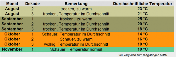Nach einem vielerorts bislang durchwachsenen Sommer, stellt sich im weiteren August und September vielfach freundliches Wetter ein; die Temperaturen liegen dabei entweder im langjährigen Durchschnitt oder nur leicht darüber.