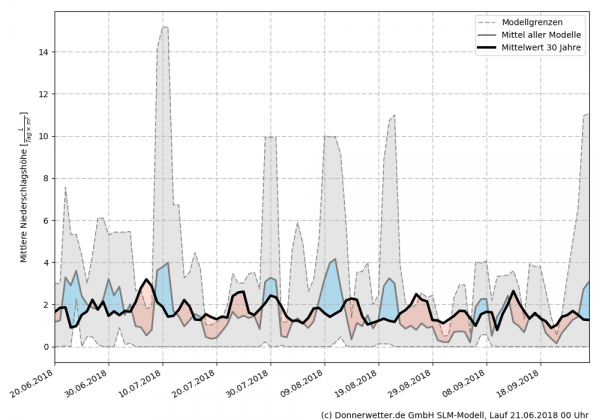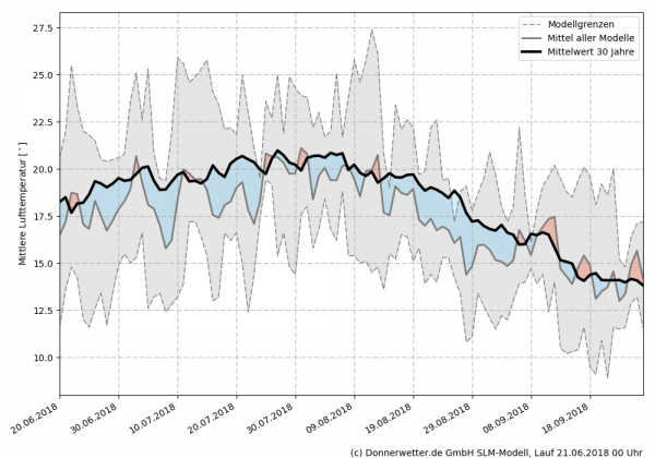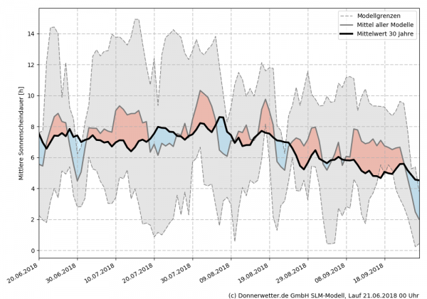 Der Blick auf den aktuell berechneten Temperaturverlauf in den nächsten Wochen lässt den westdeutschen Sommer insgesamt in keinem guten Licht erstrahlen. Immerhin schafft es die Sonne immer wieder mal, Überhand zu gewinnen. Bis Mitte des neuen Monats überwiegen weitgehend feuchte Wetterphasen.