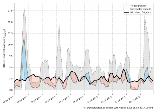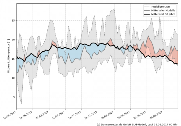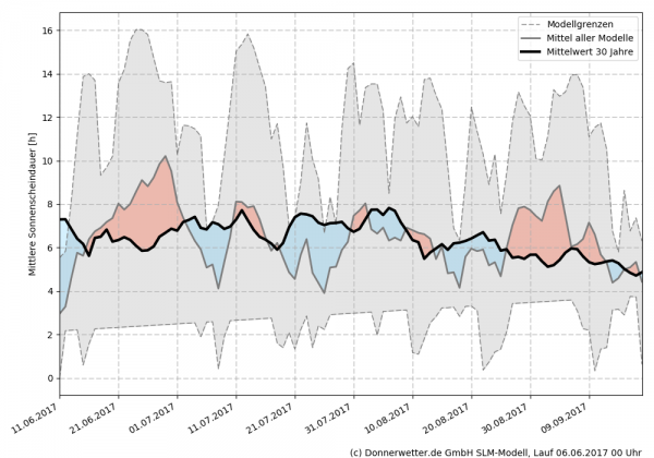 Zu kühl, zu trocken und bei den Sonnenstunden in etwa ausgeglichen - so berechnen die aktuellen Langfristmodelle auch weiterhin den Sommer 2017 für den Norden der Republik. Den genauen Verlauf der berechneten Parameter finden Sie auf den unten stehenden Grafiken.