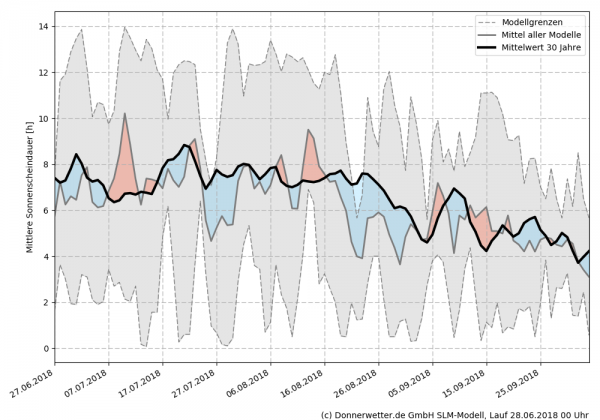 Unsere aktuellen Langfristprognosen für Lufttemperatur, Sonnenscheindauer und Niederschlagshöhe.