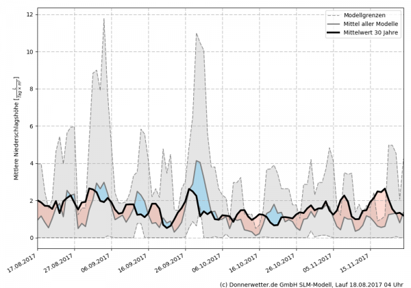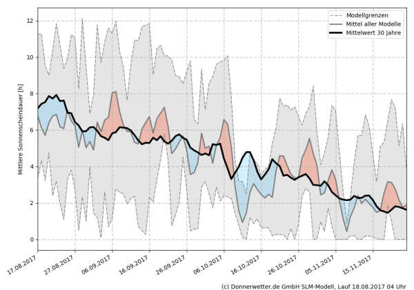 Große Temperatursprünge sind nach den aktuellen Berechnung unserer Langfristpronosen für die nächsten Wochen nicht zu erwarten: Mal liegen die zu erwartenden Mitteltemperaturen schwach über, mal schwach unter dem langjährigen Mittel. Ebenfalls ungefähr die Waage hält sich die Sonnenscheindauer über den auf den Grafiken ersichtlichen Zeitraum. Bei den Niederschlagssummen zeichnet sich ein schwach negativer Trend ab.