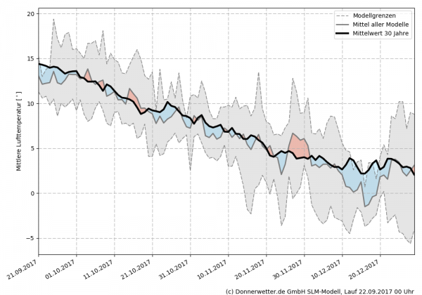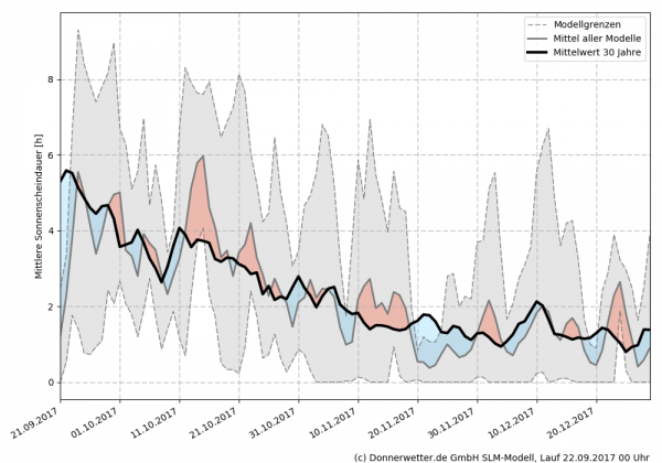 Die nächsten Wochen bringen dem Westen allenfalls durchschnittliches Herbstwetter - die mittleren Lufttemperaturen liegen meist unter dem langjährigen Durchschnitt, im Oktober sowie zwischen der letzten November- und ersten Dezemberdekade gibt es aber auch immer wieder längere trockene Phasen. Die höchste mittlere Sonnenscheindauer dürfen wir nach aktuellem Stand in der zweiten Oktoberhälfte erwarten.