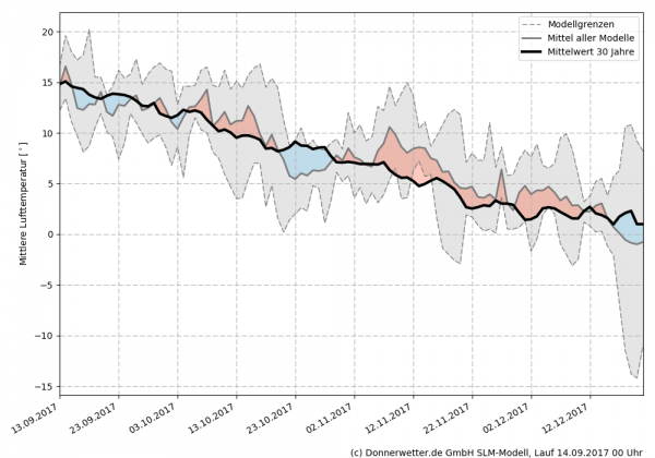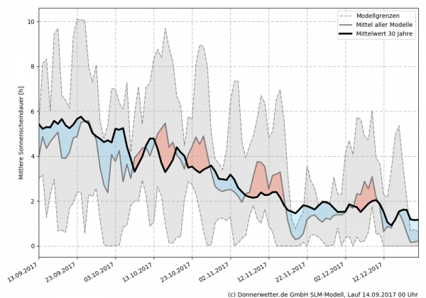 Es bleibt vorerst dabei: Ein beständiges Hoch, welches den Altweibersommer in den Osten trägt, ist aktuell nicht in Sicht. Vielmehr scheint sich das wechselhafte und eher kühle Wetter auch in der zweiten Septemberhälfte fortsetzen zu wollen. Die Anzahl der zu erwartenden Sonnestunden liegt bis Anfang Oktober zum Teil deutlich unter dem langjährigen Mittel.