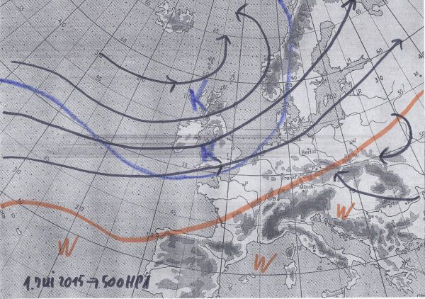 Unsere Strömungskarte von Mitteleuropa zeigt die wichtigsten Strömungslinien in etwa 5.000 m Höhe (500 hPa-Schicht) zum 1. Juli: