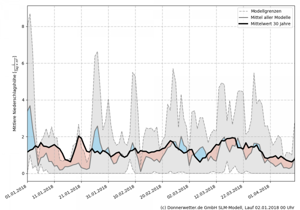 Die Temperaturen bleiben laut aktueller Modellrechnungen in den nächsten Wochen im Osten zwar auf einem jahreszeitlich hohen Niveau, von der Sonne gibt es aber auch weiterhin nur wenig zu erwarten. Längere verregnete Phasen sind dann aber auch eher selten: Die mittleren Niederschlagshöhen liegen häufig unter dem langjährigen Mittel.