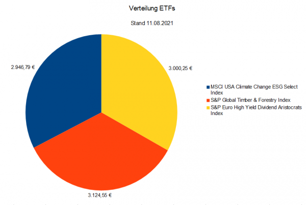 Mit einem Gesamteinsatz von 10.000 Euro setzen wir mit jeweils ca. 3.000 Euro Einsatz auf drei verschiedene ETFs aus verschiedenen Ressorts, 1.000 Euro behalten wir zunächst in der Rückhand: