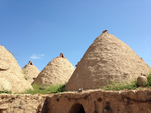 Schon von weitem sind die Kuppeln dieser besonderen Häuser unweit von Urfa (Türkei) zu sehen. Die traditionelle Hausbautechnik, hierfür kommt eine Mischung aus Ziegelsteinen und getrocknetem Lehmputz innen und außen zu Einsatz, sorgt für ein besonderes Klima im Inneren der Häuser.