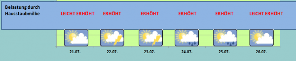 Auf Allergiker kommen in den nächsten Tagen erhöhte Hausstaubrisiken zu. Die Temperaturen bewegen sich vor allem heute und am Wochenende auf meist noch hohem Niveau, am Samstag und Sonntag sind dazu immer wieder Schauer und Gewitter zu erwarten, die die Luftfeuchtigkeit weiter ansteigen lassen.