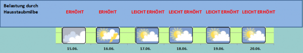 Hausstauballergiker haben es am Wochenende nicht leicht, erst im Laufe der neuen Woche nehmen die durch Hausstaubmilben verursachten Belastungen wieder leicht ab. Dennoch besteht leicht erhöhtes Risiko in der neuen Woche.