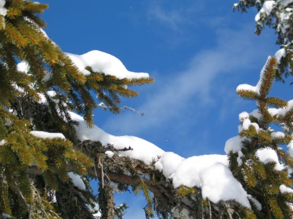 beschneite Äste vor blauem Himmel