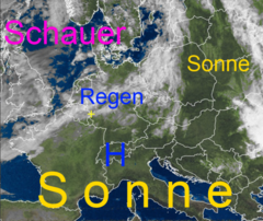 Viel Sonnenschein über Nord- und Südeuropa, dazwischen Regen- und Schauerwolken