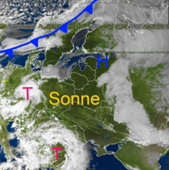 ![]() | | Satellitenbild 01.04.2017 Kaltfront überquert Deutschland mit örtlichen Regengüssen und Gewittern |