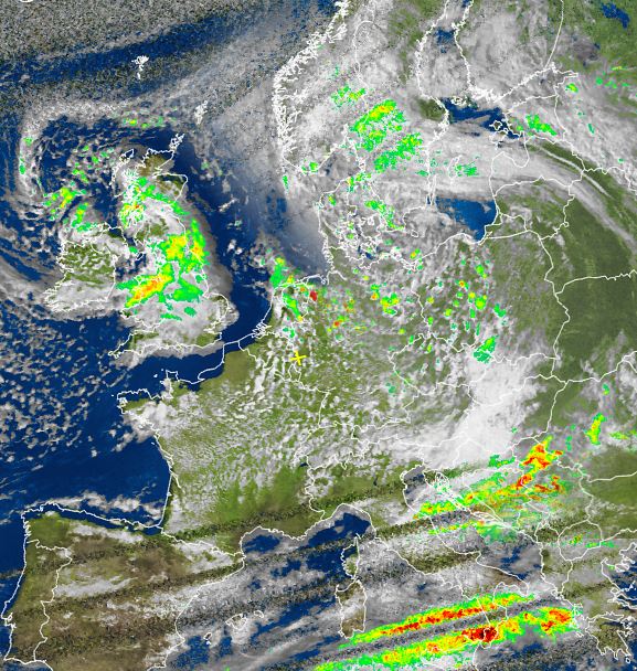 Auf dem Satellitenfoto vom heutigen Nachmittag zeigen sich weite Teile von Europa unter einer aufgelockerten Bewölkung. Ein Tief über dem Norden Deutschlands brachte besonders dem Nordwesten, jedoch auch dem übrigen Norden von Deutschland einige, zum Teil kräftige Schauer. Ein Tief bei Schottland sorgte unterdessen über großen Teilen der Britischen Inseln für oft sehr ungemütliches und nasskaltes Wetter.
